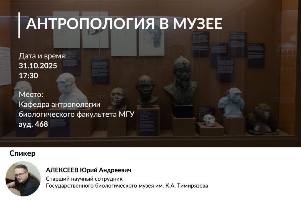 31 октября 2025 года кафедра антропологии биологического факультета МГУ имени М.В. Ломоносова проводит семинар, посвящённый теме «Антропология в музее».