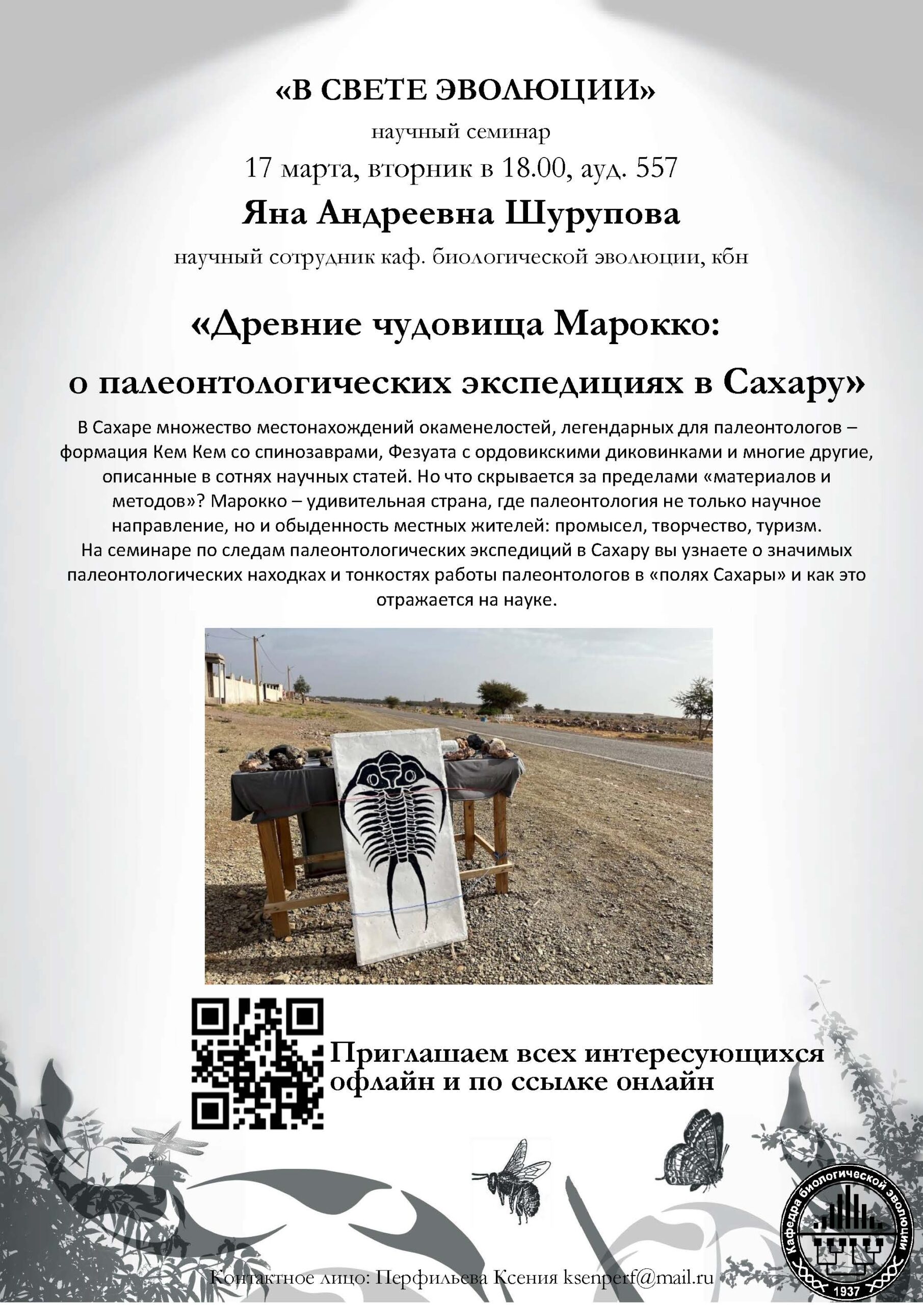 17 марта 2026 года в 18:00 в ауд. 557 Биологического факультета МГУ состоится научный семинар «В свете эволюции» кафедры биологической эволюции. Палеонтология – уникальный поставщик информации для эволюционистов. О том, как и где ее добывают расскажет палеонтолог Яна Шурупова в докладе «Древние чудовища Марокко: о палеонтологических экспедициях в Сахару».